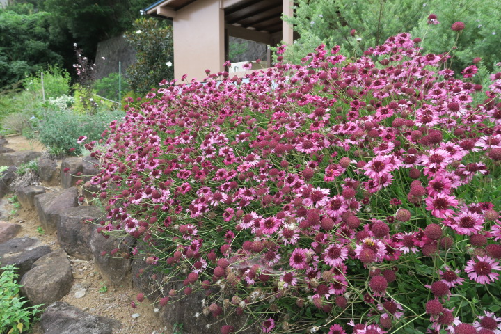 この夏の記録的な暑さを考慮して、今回は、夏の暑さにめげないガイラルディア「グレープセンセーション」を紹介したいと思います。 グレープセンセーションは、本来のガイラルディア(G. aristata とその交雑種)とは別の系列です。テキサス州のごく限られた地域に自生する G. aestivalis の変種(分布の地図はこちら)の選抜品種です。日本では歴史の浅い花です。 グレープセンセーションの一番目立つ特徴は赤紫色の花でしょう。花付きは普通ですが、開花期は5月の終わりごろから晩秋にかけての長い期間です。花が古くなると、花びらががきれいに落ちて、ボール状の面白い花がらが長く残ります。最終的にその花がらは白い綿になって飛んでいくので、切る必要はありません。手間がかからなくてありがたいです。「グレープセンセーションはこぼれ種で殖えない」と文献にはありますが、私は一個ぐらいのこぼれ種が庭に発芽したような気がします。しかし、滅多にないことは事実です。 グレープセンセーションの耐暑性は、同じテキサス出身のガウラ並みです。猛暑日でも、花は普通に咲いて、葉っぱは焼けません。私のグレープセンセーションはロックガーデンの最も乾きやすい上段に植わっていますが、降水量が平年の5%の月間でも、水をやったのは一回のみと思います。それでも、萎れる気配がありませんでした。 年月が経つにつれて一個のグレープセンセーションはゆっくりと横に拡大します。葉っぱは密に茂って、雑草を通しません。耐寒性は−20度ぐらいまでです。病害虫がほとんどなくて、長寿の宿根草だそうです。日本ではもっと使われてもいいと思います。 |